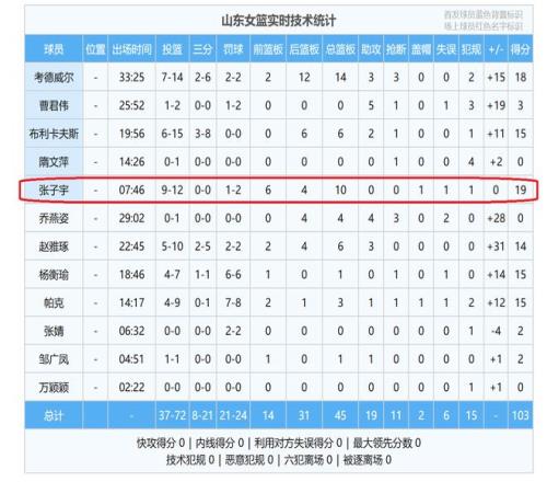 本場比賽,張子宇創(chuàng)造了3個WCBA個人職業(yè)生涯新高: