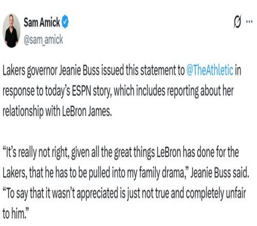 珍妮-巴斯就今日ESPN的相關(guān)報道,向The Athletic媒體發(fā)布聲明,該報道中包含了關(guān)于她與詹姆斯關(guān)系的相關(guān)內(nèi)容。珍妮表示:“勒布朗為湖人立下了汗馬功勞,如今卻被卷入我們的家族紛爭,這實(shí)在太不應(yīng)該了。說球隊(duì)不感激他的付出,這絕非事實(shí),對他而言也極度不公?!?/p>