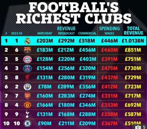 利物浦是英超唯一進入收入前五的球隊,皇家馬德里成為首支收入突破10億英鎊的俱樂部,緊隨其后的是巴塞羅那、拜仁慕尼黑和巴黎圣日耳曼。