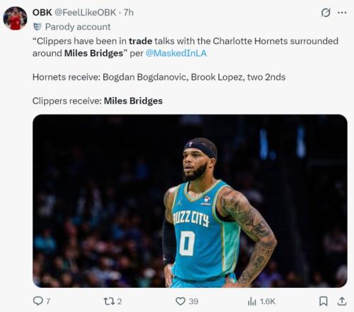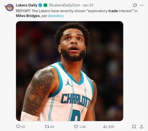 1月21日,埃文-斯迪瑞又報(bào)道,湖人與黃蜂已經(jīng)就邁爾斯-布里奇斯進(jìn)行過(guò)試探性的對(duì)話。實(shí)際上在小橋1月16日拿到25分8籃板4助攻幫助黃蜂擊敗湖人后,他的競(jìng)技狀態(tài)就暴跌。