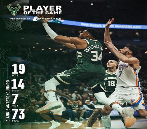 雄鹿隊(duì)超級巨頭揚(yáng)尼斯阿德托昆博,在此役展現(xiàn)了全能身手。字母哥登場31分鐘,投籃11中8,罰球6中3,砍下了19分14籃板7助攻1搶斷的兩雙數(shù)據(jù),正負(fù)值-11。字母哥以72.7%的命中率砍下了全隊(duì)的最高分,他還是此戰(zhàn)的籃板王。同時,字母哥的2個前場籃板也冠絕全場。