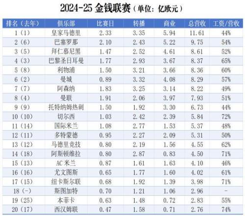 1月21日,德勤會計師事務(wù)所發(fā)布2024-25賽季金錢聯(lián)賽報告,收錄了上賽季世界足壇營收金額前20名俱樂部(以下簡稱“二十強”)的財政數(shù)據(jù)。