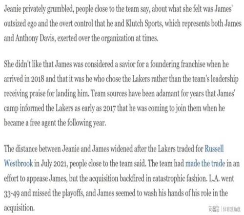 其四,2021年7月那筆拉塞爾·威斯布魯克的交易,成為了珍妮·巴斯與詹姆斯關(guān)系惡化的重要轉(zhuǎn)折點(diǎn)。當(dāng)時,球隊為了迎合詹姆斯的意愿推動了這筆交易,然而結(jié)果卻是一場災(zāi)難。湖人在該賽季僅取得33勝49負(fù)的戰(zhàn)績,無緣季后賽。更讓珍妮·巴斯不滿的是,詹姆斯似乎試圖撇清自己在推動這筆交易中的角色,缺乏應(yīng)有的擔(dān)當(dāng)。據(jù)知情人士透露,珍妮·巴斯私下對詹姆斯這種“缺乏擔(dān)當(dāng)”以及在威少交易后“將責(zé)任推給他人”的做法極為不滿。