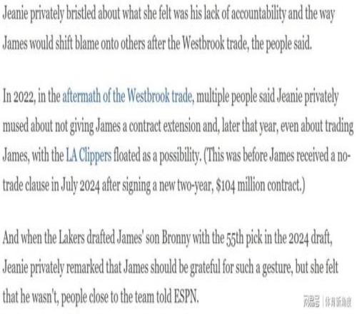 其五,在球隊管理層面,珍妮·巴斯曾私下考慮不再為詹姆斯提供續(xù)約合同,甚至與相關(guān)人員討論過交易他的可能性。這其中,她認(rèn)為詹姆斯并未對湖人選中其子布朗尼·詹姆斯表現(xiàn)出足夠的感激之情,這一因素也在一定程度上影響了她的決策考量。盡管最終珍妮·巴斯勉強(qiáng)同意與詹姆斯續(xù)約,但主要原因是擔(dān)心拒絕續(xù)約會引發(fā)嚴(yán)重的公關(guān)危機(jī),給球隊形象帶來負(fù)面影響。