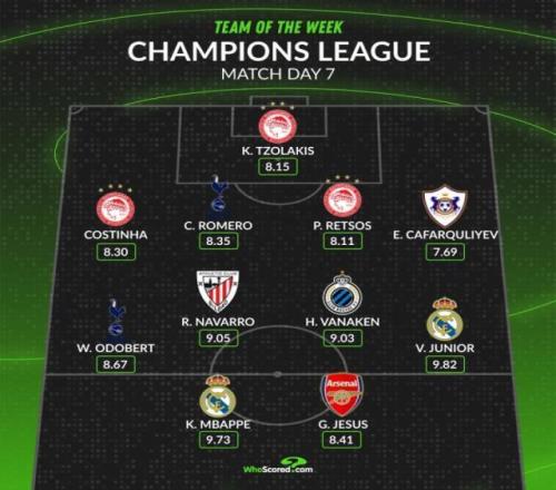 1月22報道 歐冠聯(lián)賽階段第7輪比賽戰(zhàn)罷,WhoScored列出了本輪最佳陣容,姆巴佩、維尼修斯、熱蘇斯在列。