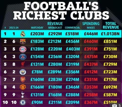 據(jù)《每日電訊報(bào)》報(bào)道,曼聯(lián)首次在德勤足球財(cái)富榜中被利物浦和阿森納超越,而皇馬仍舊穩(wěn)居榜首,顯示其在商業(yè)上的巨大成功。