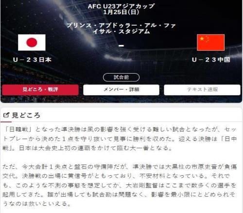 在上屆U23亞洲杯中,中國隊曾與日本隊交手,那場比賽日本隊在開場17分鐘就被罰下一人,令人遺憾的是,整場多打一人的中國隊最終以0-1輸?shù)袅吮荣?,兩年后,兩隊再次在U23亞洲杯中相遇,不同的是,這次是在決賽舞臺上,這種歷史背景讓本次決賽增添了更多故事性,對中國隊而言,這不僅是爭奪冠軍的機會,也是彌補上次遺憾的良機,對日本隊來說,他們正為賽事歷史上首次衛(wèi)冕而戰(zhàn)