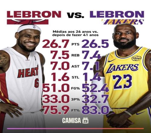 26歲時,詹姆斯場均26.7分、7.5個籃板、7.0次助攻、1.6次搶斷,投籃命中率51.0%,三分命中率33.0%,罰球命中率75.9%。滿41歲之后,場均26.5分、7.4個籃板、7.1次助攻、1.4次搶斷,投籃命中率52.4%,三分命中率32.7%,罰球命中率83.0%。