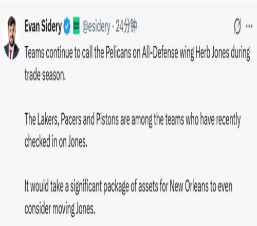 北京時(shí)間1月24日,據(jù)名記Sidery報(bào)道,交易窗口期,多支球隊(duì)持續(xù)向新奧爾良鵜鶘隊(duì)詢價(jià)全明星級(jí)防守側(cè)翼赫伯特-瓊斯。洛杉磯湖人、印第安納步行者以及底特律活塞均在近期就瓊斯的交易可能性,向鵜鶘隊(duì)進(jìn)行了咨詢。想要讓鵜鶘隊(duì)認(rèn)真考慮放走瓊斯,對方必須拿出一份包含大量優(yōu)質(zhì)籌碼的交易方案。
