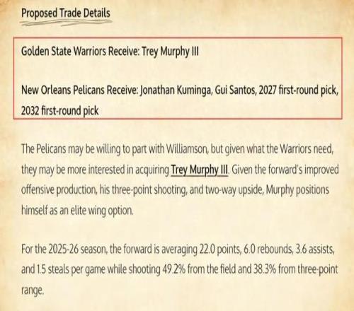 美媒《Fadeaway Wolrd》撰文建議,勇士應該將庫明加、桑托斯、2027年以及2032年的首輪簽送到鵜鶘,換回墨菲。