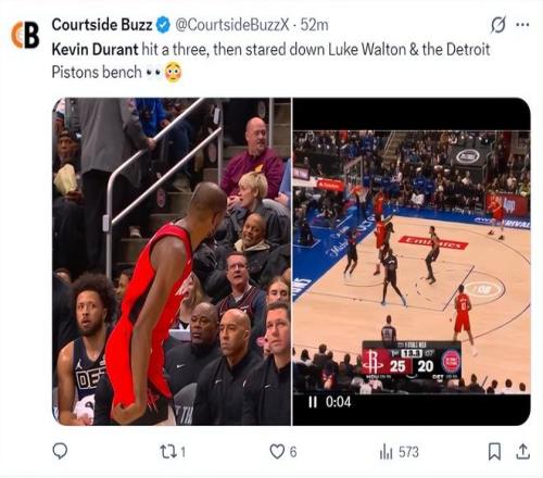 第一節(jié)杜蘭特命中幾乎壓哨的三分球后,杜蘭特怒視著活塞替補(bǔ)席與盧克-沃頓。