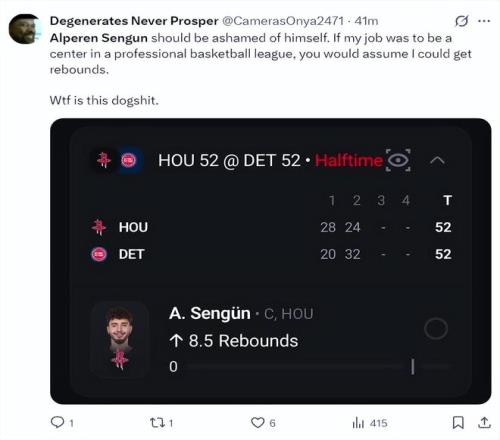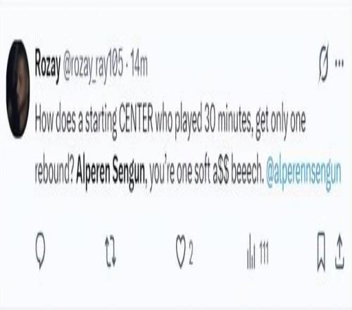 北京時間1月24日,火箭以111-104復(fù)仇活塞。這場比賽火箭隊的先發(fā)中鋒阿爾佩倫-申京延續(xù)了他對陣費(fèi)城的低迷狀態(tài),此役他的拉胯更盛,火箭球迷們對他已經(jīng)忍無可忍在社媒上各種炮轟,全都是因?yàn)樯昃┳鳛橐幻?尺11(2.11米)的中鋒只有1個籃板。