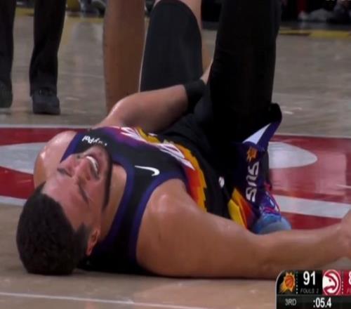 除了杰倫-格林外,太陽最麻煩是太子爺布克也在比賽第三節(jié)因傷退賽,慢鏡頭顯示他跑動時踩到奧孔武德腳導(dǎo)致嚴重崴腳。
