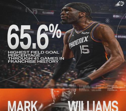 今天聊聊太陽中鋒馬克-威廉姆斯,昔日的玻璃中鋒,本賽季也恢復(fù)健康了。加盟太陽之前,馬威出勤率最高的一個(gè)賽季只打了44場常規(guī)賽。本賽季至今,馬威已經(jīng)打了39場常規(guī)賽,只缺席了5場,他肯定能打破生涯出勤率紀(jì)錄。