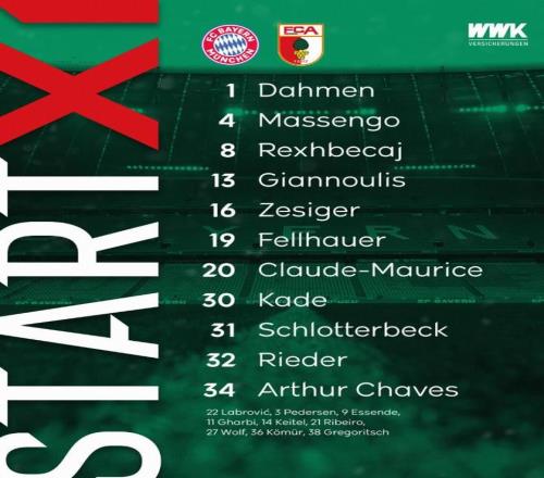 奧格斯堡首發(fā):1-達門、34-阿圖爾-查韋斯、31-凱文-施洛特貝克雷、16-澤西格爾、13-吉安努利斯、4-馬森戈、19-菲爾豪爾、8-雷克斯貝卡伊、20-毛里斯、32-法比安-里德、30-安東-卡德