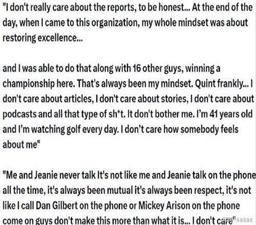 當(dāng)被問到近期是否與珍妮·巴斯有過交流時,詹姆斯的回答十分干脆:“我們之間幾乎沒什么交流。我不明白,其實(shí)我和珍妮之前也很少打電話溝通,你們應(yīng)該也沒見過相關(guān)的報道吧。我不會把這種事小題大做,我們彼此尊重,雙方一直保持著良好的合作關(guān)系。但我也不會特意給她,就像我從未給熱火隊(duì)老板米奇·阿里森或者騎士隊(duì)老板吉爾伯特打過電話一樣。得了吧,各位,別把這事兒無限放大了,我真的不在乎?!?/p>