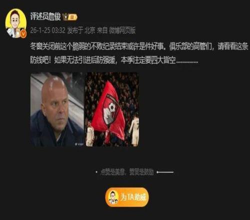 北京時(shí)間1月25日,英超第23輪,利物浦客場(chǎng)2-3慘遭伯恩茅斯絕殺,進(jìn)入2026年以來(lái)英超還未贏過(guò)。本場(chǎng)比賽,利物浦在客場(chǎng)一度0-2落后對(duì)手,但靠著范戴克的角球破門(mén)和索博的80分鐘的任意球破門(mén)一度扳平比分。比賽90+4分鐘,伯恩茅斯利用界外球機(jī)會(huì),由阿德利打入制勝一球。最終,伯恩茅斯3-2絕殺利物浦,終結(jié)對(duì)手各項(xiàng)賽事13場(chǎng)不敗的紀(jì)錄。