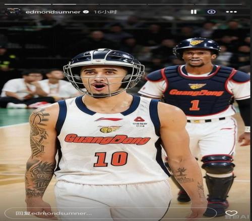 賽后,廣東外援薩姆納和奎因都在社媒發(fā)了一張自己帶護具上場的AI圖片。
