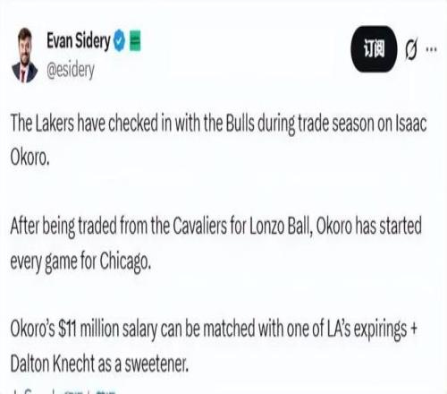 奧科羅則是更加靠譜的選擇,美記Evan Sidery此前也曝出湖人已經(jīng)向公牛隊(duì)詢價(jià),希望圍繞克內(nèi)克特+到期合同作為核心籌碼追求奧科羅。