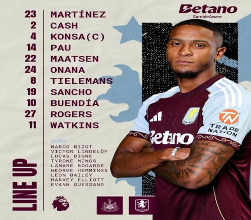 阿斯頓維拉首發(fā):23-達(dá)米安-馬丁內(nèi)斯、2-卡什、4-孔薩、14-保-托雷斯、22-馬特森、24-奧納納、8-蒂勒曼斯、19-桑喬、10-布恩迪亞、27-摩根-羅杰斯、11-沃特金斯