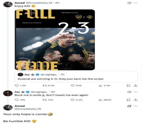 曼聯(lián)在英超客場3-2擊敗阿森納,取得聯(lián)賽兩連勝。賽后,曼聯(lián)球員阿馬德在社交媒體上回擊賽前唱衰球隊的阿森納球迷。