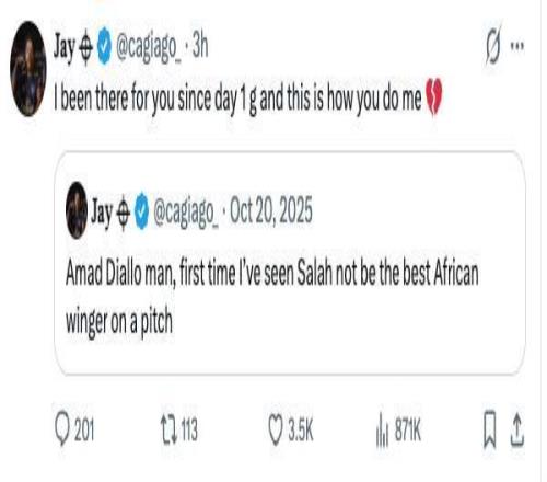 隨后該槍手球迷轉發(fā)他此前在2025年10月發(fā)布的一篇帖子,該帖子內容是:阿馬德-迪亞洛,兄弟,這是我第一次看到薩拉赫在同一塊場地上不再是表現(xiàn)最好的非洲邊鋒。