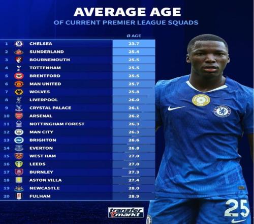 北京時間1月26日,德轉(zhuǎn)統(tǒng)計出了本賽季英超20支球隊的平局年齡,切爾西的現(xiàn)有陣容平均年齡僅為23.7歲,為英超最年輕球隊,富勒姆28.9歲為平均年齡最年長的球隊。